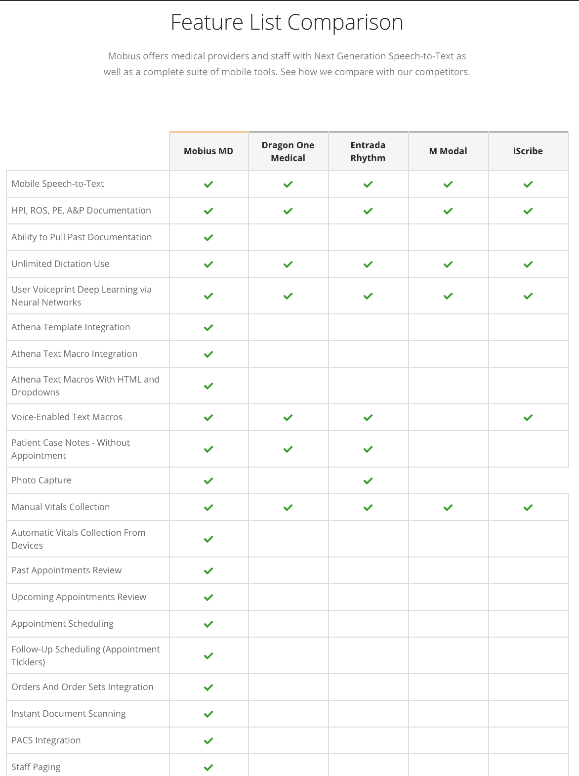 If you need a mobile-ready dictation solution built to streamline clinical workflow, it may be time to upgrade your medical dictation software. Here’s a summary of features offered by Mobius Scribe, including how these features compare to apps by leading competitors.